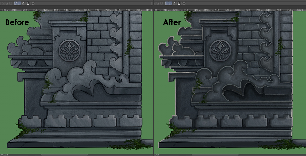 Last week, I immediately started with coloring the stone gate--but after finishing it the first time, I compared it to the monkey statue in the forest background (for quality-control). I realized then that it feels a bit lacking so I took a step further with polishing: