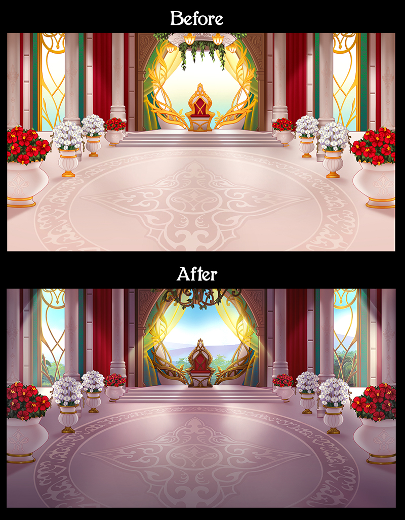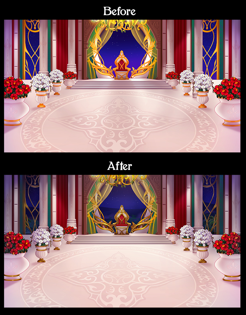 Last week, I got into the zone & thanks to ErdaEnos, the polishing of the Throne Room Backgrounds are done! She helped me a lot by lending me her eyes & opinions about making things more realistic (especially about the gold!). Well, a picture speaks more than 1000 words, so here's a preview of Before and After!